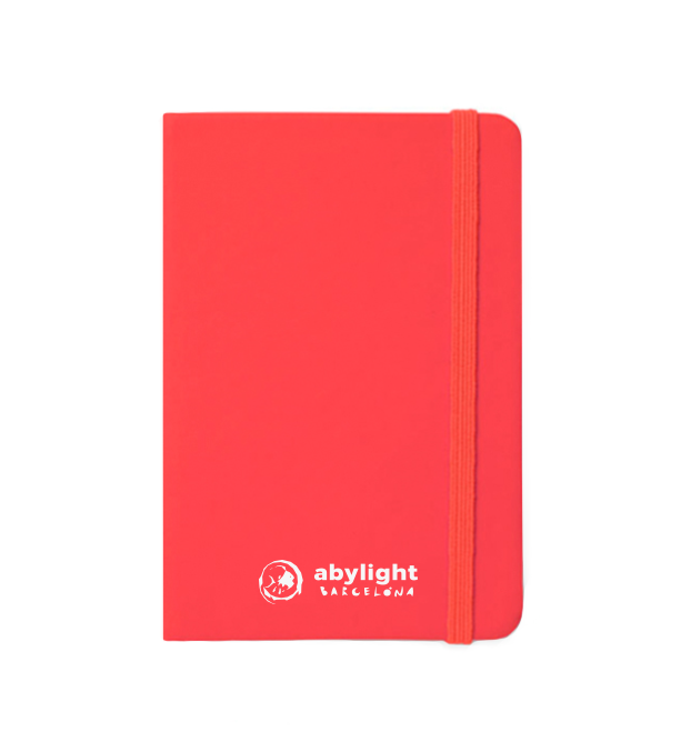 Cuaderno tamaño A5 con 80 páginas lisas y tapa dura. La cubierta es de polipiel, de color rojo con el logotipo de Abylight Barcelona estampado en blanco.