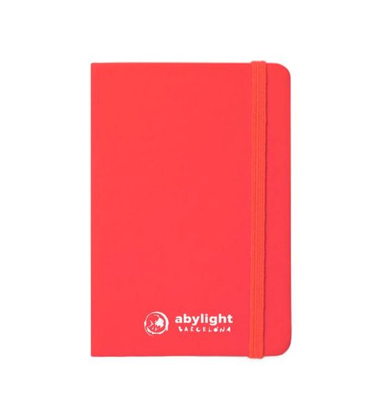 A5 size notebook with 80 plain pages and hard cover. Cover is made of leatherette, in color red with the Abylight Barcelona logo printed in white.